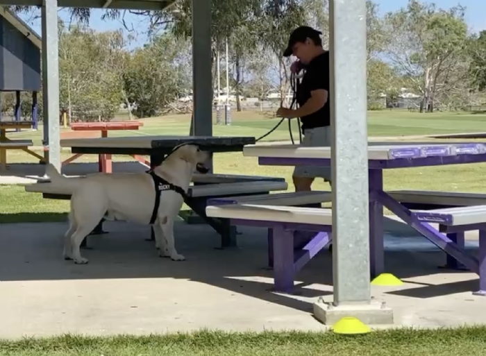 Handlers take their dogs through a search area which may be set up in a variety of environments (inside, outside, vehicles). The dog and handler must work together as a team. The handler as part of the team may use body language and verbal encouragement to ensure all sections of the search area are covered, directing the dog's search when necessary and indicating to the Judge when the dog has found the hide. Communication with praise of the dog during the search is encouraged.